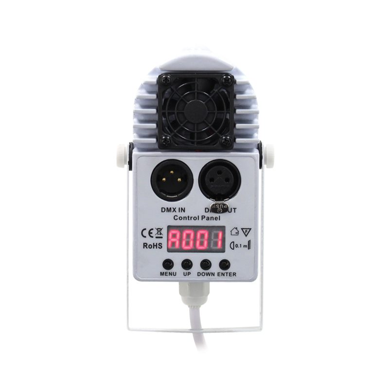 1 x 12W quadcolour LED (RGBW), Beam angle: 4 Degree, DMX channels: 6, Auto, sound active and master/slave modes, 0100% dimming and variable strobe, Lightweight case design, Internal electronic transformer, Low heat output and power consumption, Supplied with hanging bracket, 4 push button menu with LED display, Captive power connection, 3Pin XLR input/output, Fan cooled