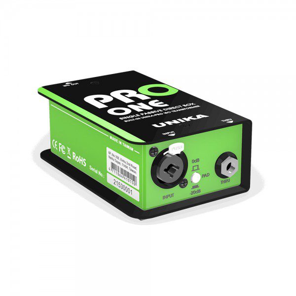 PRO ONE è una DI box passiva a canale singolo. Per farla funzionare non è necessario inserire una batteria o fornire alimentazione phantom.
