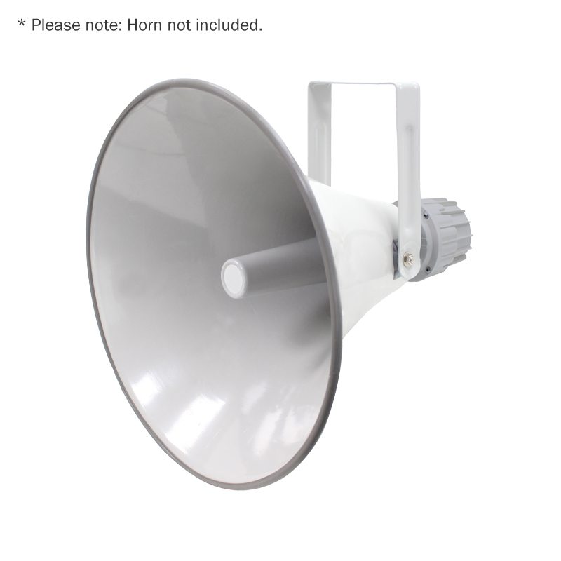 High efficiency, screw-on, 100V horn driver suitable for use with most public address horn flares fitted with a 1 3/8” thread. Manufactured using a die-cast aluminium chassis with a durable plastic rear cover, the drivers feature a flying lead and selectable output wattage taps.