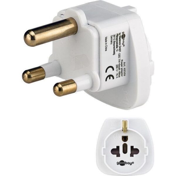 • Adattatore di alimentazione per collegare i dispositivi con spina per Sud Africa alle prese elettriche CEE 7/4• L’adattatore non converte la tensione di linea!• Assicurarsi che il dispositivo possa funzionare con la tensione di linea prima di usarlo• Colore: biancoConnessioni• Ingresso, tipo Spina Schuko (Tipo F, CEE 7/4)• Uscita, max. amperaggio 10 A• Uscita, connettore di alimentazione di tipo sudafricano femmina (tipo F, BS 546, 15-A)