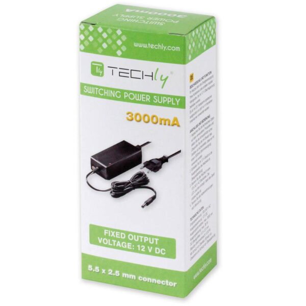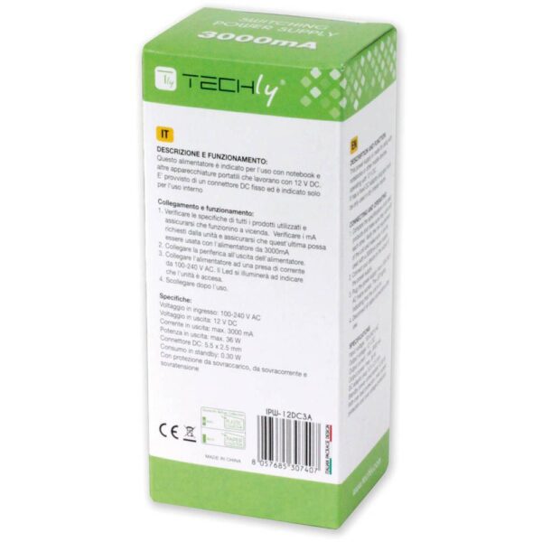 Alimentatore AC/DC fisso compatta conforme alle norme internazionali di risparmio energetico e normativa CEE. Obiettivo di questi standard è una riduzione di assorbimento di energia sugli apparecchi in stand-by, che incidono in una riduzione delle emissioni di CO ².Indicato per l’uso con notebook e altri dispositivi portatili che lavorano con 12V DC. E’ provvisto di un connettore DC fisso ed è indicato solo per l’uso interno.• Prodotto secondo direttiva EuP 2005/32/EG• Risparmio energetico fino al 94% in ‘stand-by-mode’ • Risparmi fino al 30% di energia sotto caricoCaratteristiche• Particolarmente leggero adatto per il trasporto• Consumo in Stand-by di solo 0,3 W • Plug DC: 5,5 x 2,5 x 10 mm • Con indicazione LED di alimentazione Specifiche tecniche• Alimentazione in ingresso: 100-240 V AC • Alimentazione in uscita: 12 V DC • Corrente di uscita: 3.000 mA • Potenza in uscita: max 36 W• Spina d’ingresso Euro AC• StabilizzatoProtezioni• Sovraccarico• Sovracorrente• SovratensioneDimensioni• Lunghezza 110 mm• Larghezza 48 mm• Altezza 30 mmCertificazioni• CE• RoHS• RAEEContenuto della confezione• Alimentatore IPW-12DC3A