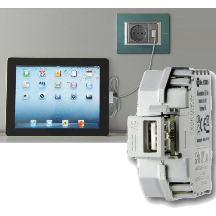 • Alimentatore USB che, per mezzo di appositi adattatori, può essere installato su tutte le principali serie civili da incasso, grazie all’aggancio standard Keystone Jack• Finalmente un unico alimentatore che, tramite la connessione USB, è in grado di ricaricare i diversi dispositivi portatili: cellulari, smartphone, tablet, lettori MP3/MP4 console giochi, foto e video camere, gps, …• E’ sufficiente disporre di uno spazio libero su un punto luce o una presa e il problema è risolto definitivamente: basta cavi aggrovigliati, basta confusione di adattatori e alimentatori diversi!• L’uscita a 5V 2.1A lo rende idoneo anche per la ricarica di iPad e tablet • Funzione di risparmio energetico: quando nessun dispositivo è collegato si spegne automaticamenteCaratteristiche tecniche• Tensione nominale in ingresso: 230V 50-60 Hz, 0.1A • Tensione in uscita: 5V DC + / – 5% • Corrente di uscita massima: 2.1A • Consumo di energia in standby: ≤ 0,2 W • Potenza massima: 4,0 W a 2,1 A di uscita• Impulso di tensione nominale: 2.5KV • Corrente massima assorbita: ≤0,25A (cavi da 1,5 mm2) • Standard: USB• Classe di protezione: Classe II • Grado di inquinamento: 2• Categoria di sovratensione: II • Temperature ambiente minima: -10 °C • Temperatura ambiente massima: +40 °C • Tipo di conduttore: filo elettrico interno a 1,5 mm2 • Tipo di connessione: morsetti a vite • Numero di poli: 2 • Sezione cavo incrociato: 2×1, 5mm2 • Grado di protezione: IP20 • Ricablabile: Sì• Dimensioni: 55 x 22 x 56 mm• Colore: nero