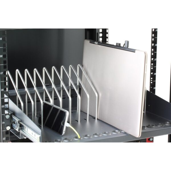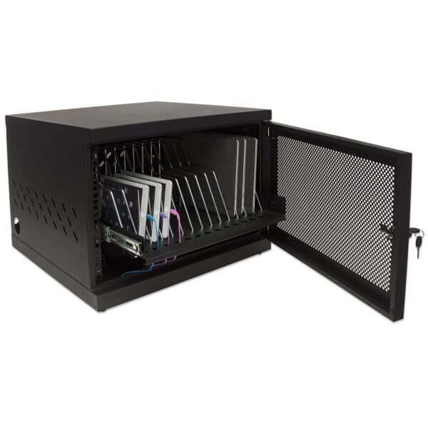 • Stazione di ricarica per dispositivi mobili: permette di depositare e caricare fino a 14 dispositivi• Alloggiamenti 30 x 25,5 x 2,3 cm • Compatibile con iPad, Chromebooks, Ultrabooks, Netbooks, MacBooks, tablets, smartphone e molto altro• Una mensola scorrevole e regolabile con divisori removibili e gestione dei cavi integrata• Completamente assemblato, costruzione in acciaio• Ventilato per una migliore circolazione dell’aria• Caricabatterie per cellulari e cavi di ricarica non inclusiSpecifiche• Fori posteriori per montaggio a parete• Fori laterali per passaggio cavi• Pannelli laterali con sezione grigliata per una maggiore areazione• Top e fondo privi di fori• Porta frontale grigliata con serratura a chiave• Retro aerato, privo di pannello di chiusura• Luce dei montanti: 35 cm• Spazio posteriore libero: 8 cmCaratteristiche fisiche• Dimensioni esterne armadio: 55 x 55 x 41 cm• Dimensioni alloggiamento (14): 2,3 x 30 x 25,5 cm• Peso: 19 kg• Struttura: 1 mm, acciaio verniciato a polvere• Colore: neroContenuto della confezione• Armadietto professionale da scrivania per ricarica tablet • Chiavi di chiusura• Manuale utente