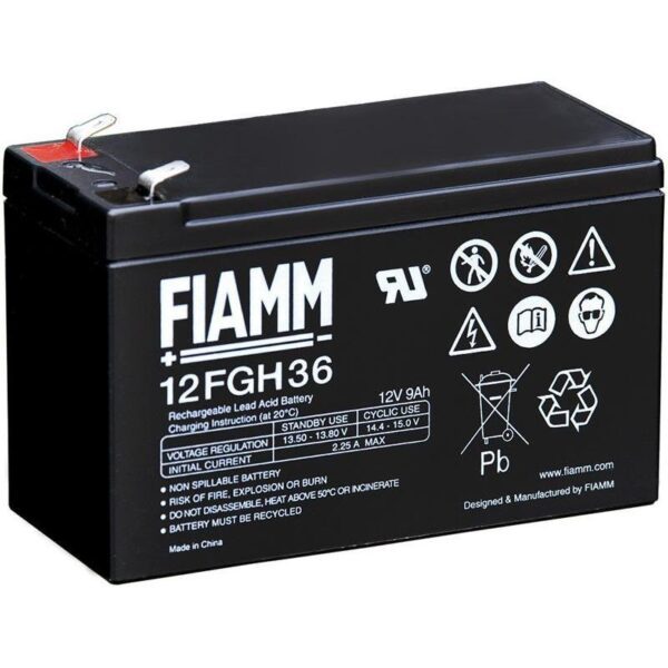 Batterie progettate per ottenere prestazioni ottimali e per la protezione dai disturbi di linea. Ideali per: – Applicazioni UPS ad alta intensità di scarica- Sistemi di alimentazione di emergenza- Sistemi di sicurezza e allarmeSpecifiche tecniche• Capacità: 9000mAh• Voltaggio: 12 Volt• Sistema: Batteria piombo-acido• Terminale: Faston 6.3 mmTemperature di funzionamento• Ricarica: 0 / 40 °C• Scarica: -20 / 50 °C• Stoccaggio: -20 / 50 °CDimensioni• Lunghezza: 151 mm• Larghezza: 65 mm• Altezza: 94 mm• Peso: 2,80 kgContenuto della confezione• Batteria Piombo Acido Fiamm FGH36