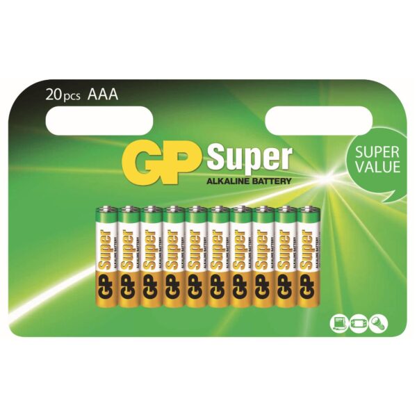 GP Super è una batteria alcalina standard perfetta per la maggior parte dei prodotti con medio-alto assorbimento, come ad esempio giocattoli, orologi da parete e torce elettriche.GP Super offre una gamma completa di batterie alcaline che può essere fornita in confezioni multiple come in singoli blister.Specifiche• Non contengono mercurio o piombo• Perfette per coloro che utilizzano molte batterie• Lunga durata (prima dell’uso) – fino a 7 anni• Confezione da 20 pezzi• Formato AAA Ministilo