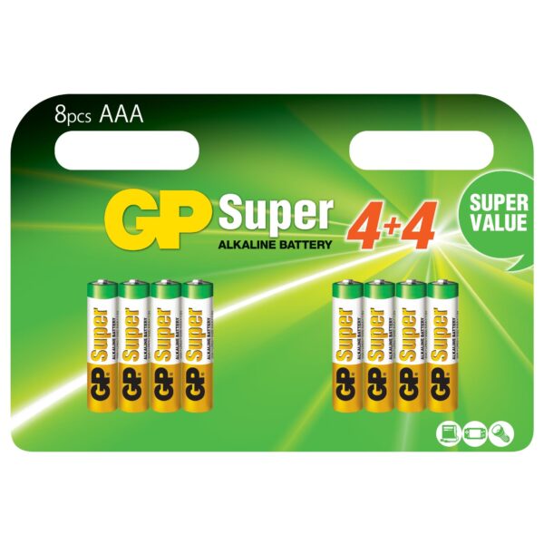 GP Super è una batteria alcalina standard perfetta per la maggior parte dei prodotti con medio-alto assorbimento, come ad esempio giocattoli, orologi da parete e torce elettriche.GP Super offre una gamma completa di batterie alcaline che può essere fornita in confezioni multiple come in singoli blister.Specifiche• Formato batterie: AAA Mini stilo• Non contengono mercurio o piombo• Perfette per coloro che utilizzano molte batterie• Lunga durata (prima dell’uso) – fino a 7 anni
