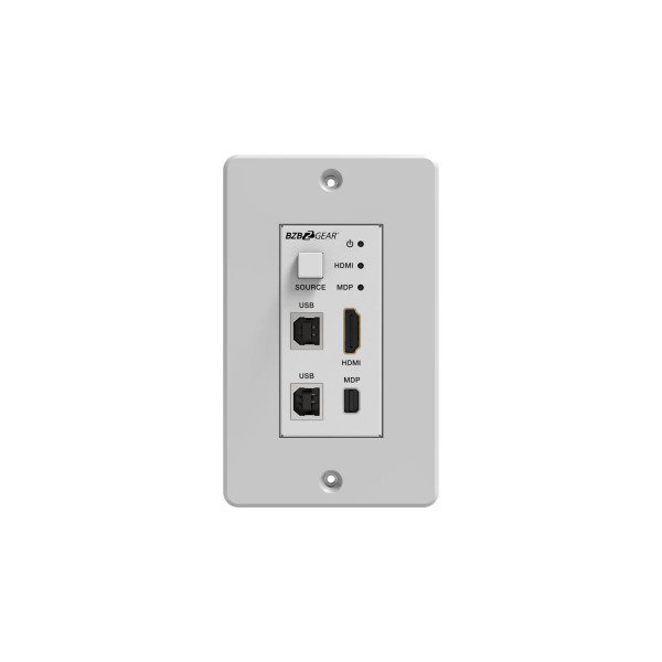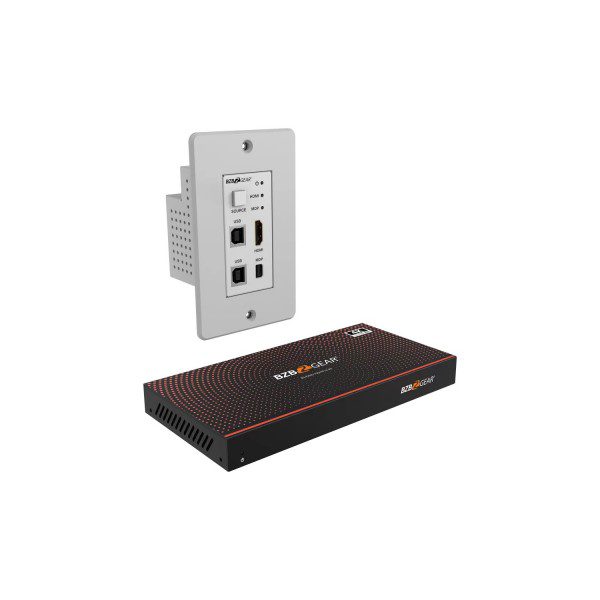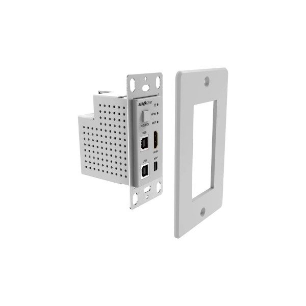 Progettato per adattarsi perfettamente alle aperture per placche a muro in stile Decora, il kit presenta un elegante alloggiamento US one-gang. Il trasmettitore da parete funge da switcher 2×1 e trasmettitore HDBaseT, supportando ingressi HDMI e DisplayPort (DP) e integrando anche la funzionalità KVM USB 2.0.