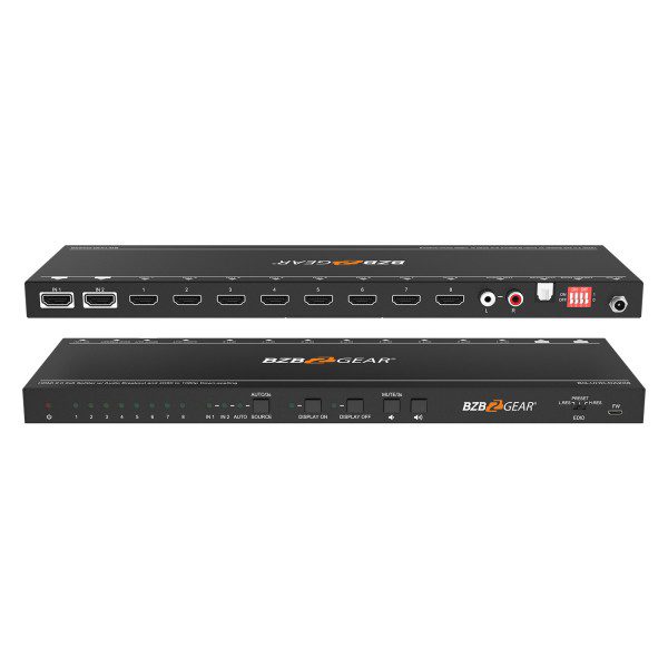 L’estrazione audio viene fornita tramite le connessioni stereo RCA e Toslink, consentendo di collegare BG-UHD-DA2X8 a un sistema audio esterno. Il controllo CEC consente allo splitter di accendere e spegnere i display compatibili e di regolare i livelli del volume per un facile controllo centralizzato.