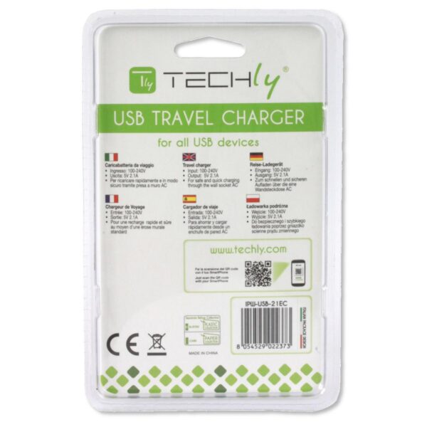 Caricabatterie USB compatto, pratico e molto efficiente. per ricaricare dispositivi mobili come smartphone, tablet, navigatori, PDA, lettori MP3 e molto altro.Grazie alle sue dimensioni ridotte e al peso ultra leggero, è comodissimo da portare con sé ovunque si vada.Garantisce la massima sicurezza con protezione contro il sovraccarico, sovratensione, corto circuito e surriscaldamento.Specifiche tecniche• Alimentazione: 100-240 V, 50-60 Hz• Tensione di uscita: 5V• Corrente di uscita: 2,1A• Numero di porte USB di uscita: 1• Corrente in ingresso: 450mA (rms) max @ 90V AC• Consumo in stand-by: 0.075W max• Classe energetica: VI Caratteristiche ambientali• Temperatura operativa: -5 / 45 °C• Temperatura di stoccaggio: -20 / 70 °C• Umidità: 35% – 85% RHDimensioni• Larghezza 37,3 mm• Altezza 67 mm• Profondità 20 mmCertificazioni• CE • FCC• RAEEContenuto della confezione• Alimentatore 1 porta USB bianco• Manuale utente