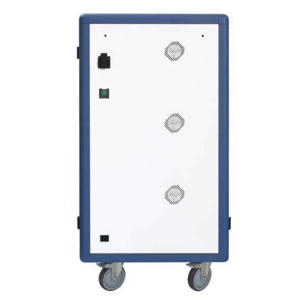 · Carrello stazione di ricarica con 3 ripiani da 10 posti ciascuno, per un totale di 30 alloggiamenti in plastica con passacavo per gestire comodamente i cavi collegati