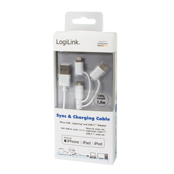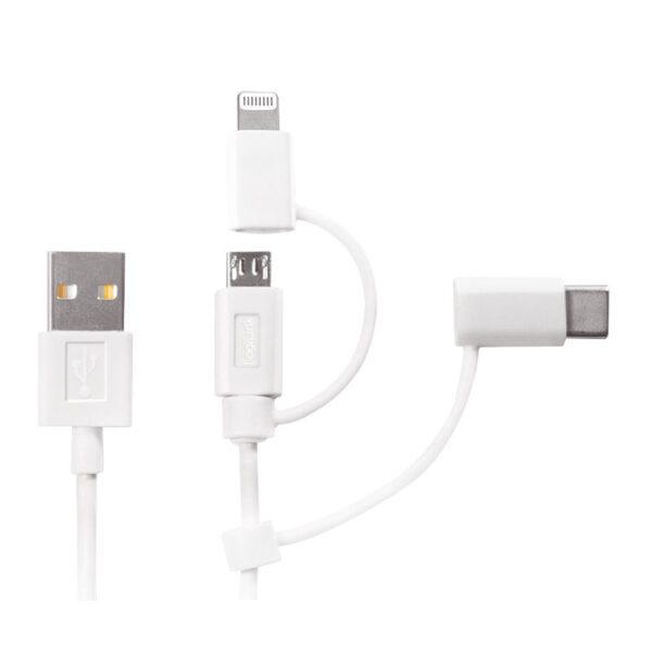 Cavo con 3 connessioni ideale per il trasferimento dei dai. la sincronizzazione e la ricaricaCaratteristiche• Cavo di ricarica e dati USB 3 in 1• Indicato per dispositivi con porta Micro-USB, USB-C o Lightning • Connessione da USB-A maschio a Micro-B maschio / Lightning® maschio / USB-C™ maschio• Colore: bianco• Lunghezza: 1 metroContenuto della confezione• 1 x cavo di sincronizzazione e ricarica • 1 x manuale utente