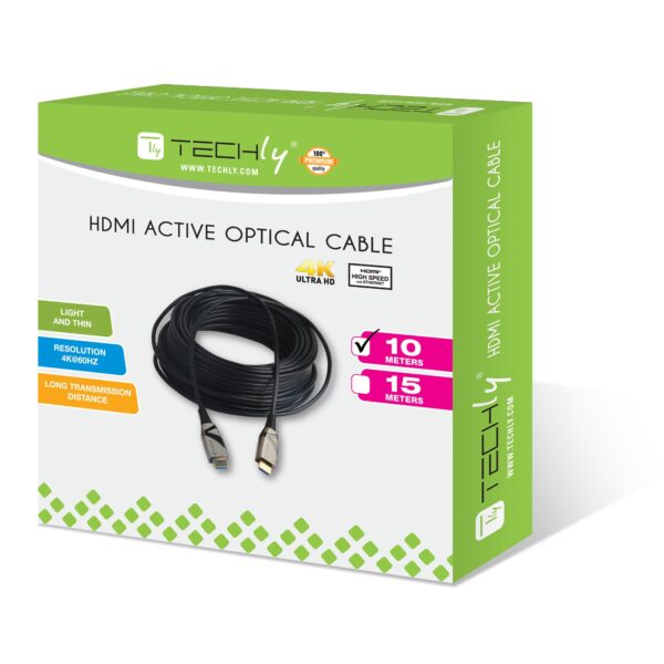 Il cavo audio video HDMI ad alta velocità attivo è caratterizzato da conduttori in rame e in fibra, offrendo una struttura più leggera e flessibile ideale per l’installazione in spazi ristretti e a distanze maggiori: la soluzione ideale per sale conferenze, aule, insegne luminose e molto altro ancora.Il cavo HDMI ibrido consente la trasmissione di segnali video e audio ad alta qualità su lunghe distanze senza perdita di qualità. I segnali provenienti da fonti come il Blu-ray, lettori multimediali, DVD, SAT etc. vengono ricevuti da TV UHD e FullHD e proiettori con una risoluzione fino a 4Kx2K. Il cavo HDMI High Speed in fibra ottica supporta risoluzioni video 4Kx2K/UHD (max 3840×2160 e 4096×2160 @60Hz), 1080p/FullHD, 1080i, 720p, 480p. Supporta standard Deep Colour, HDCP 2.2, EDID, CEC e ARCNB: questo cavo presenta un’architettura unidirezionale che richiede l’installazione del cavo nella direzione corretta. Controllare le etichette ‘source’ e ‘display’ sui connettori HDMI per verificare che il dispositivo e la sorgente HDMI siano collegati correttamente.Caratteristiche• Più sottile, più leggero e più morbido del tradizionale cavo di rame• Supporta lunga distanza di trasmissione• Altamente resistente con EMI e RFI• Supporta alte risoluzioni: 4K @60Hz Ultra HD• Conforme al collegamento con tutti i dispositivi connettore HDMI tipo A• Compatibile con la versione HDMI 2.0 / 1.4 • Supporta dispositivi in formato HDR 4K• Velocità trasmissione dati: 18 Gbps• Facile da installare; Plug and play• Basso consumo energetico e nessuna necessità di alimentazione esterna• Supporta il formato 4K2K a 60 Hz HDR / 3D / 1080p / 1080i / 720p• Supporta HDCP / EDID / CEC / DDC• Supporto audio• Grazie al design flessibile e sottile è l’ideale per le installazioni dove lo spazio è ristretto o limitato• Lunghezza: 10m; Colore: neroApplicazioni• Home theater• Sistema di videoconferenza ad alta definizione• Sistema Video Medico• Sistema di videosorveglianza ad alta definizione• Segnale digitale e TV WallSpecifiche tecniche• Risoluzione supportata: 3840 * 2160 (4K * 2K)• FPS: 60 max.• YGB: 4: 2: 0 o 4: 4: 4• HDCP: Pass (2.2)• Soddisfa i requisiti HDMI 2.0Contenuto della confezione• Cavo HDMI su fibra ottica 10m