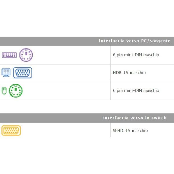 • Cavo di collegamento per Master switch• Connettore PC: HDB & PS2 • Connettore console: SPHD 3 in 1 (tastiera / mouse / video) • Lunghezza: 3m (sottile) • Colore: neroConnessioni• Interfaccia verso PC/sorgente:- 6 pin mini-DIN maschio- HDB-15 maschio- 6 pin mini-DIN maschio• Interfaccia verso lo switch:- SPHD-15 maschioContenuto della confezione• Cavo triplo per Master switch