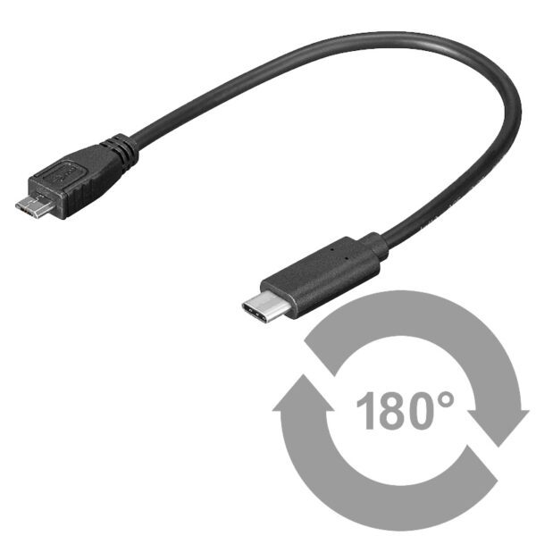 • Cavo di sincronizzazione e ricarica USB• Velocità di trasferimento dati massima 480Mbit/s• Massima potenza 2,5 W• Connessioni: USB Micro-B / USB-C™• Il connettore USB-C™ è reversibileConnettori• 1 x Connettore USB Micro-B 2.0 Maschio• 1 x Connettore USB-C™ Maschio Specifiche tecniche• Velocità massima di trasferimento dati di 480 Mbit/s• Conduttore interno in rame• Configurazione connettore MicroB > connettore C• Standard USB 3.1 SuperSpeed• Lunghezza 0.20 m• Colore neroContenuto della confezione• Cavo adattatore da USB MicroB a USB-C™ 20cm