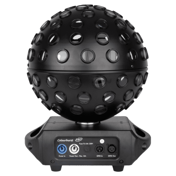 Showtec Colourburst PRO è un potente RGBW effetto palla a specchio. Offre un controllo completo su tutti i colori in 5 sezioni e una rotazione bidirezionale infinita tramite DMX, manuale, master/slave o funzionamento autonomo. Ha fasci di luce a 2 gradi e una copertura a 360° con 98 lenti/fasci per creare atmosfere romantiche ed effetti dinamici da discoteca. I programmi e gli effetti incorporati possono essere applicati in modalità audio, automatica e DMX. Dispone di un display OLED per il controllo e la regolazione dei parametri. Showtec Colourburst PRO può essere posizionato verso l’alto su qualsiasi superficie o verso il basso con la staffa di sospensione inclusa Quicklock. È possibile collegare più unità in cascata utilizzando sia connettori DMX sia Power Pro.
