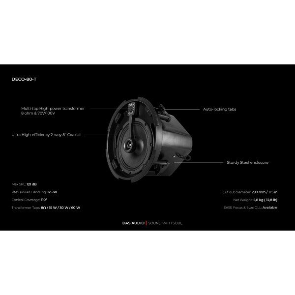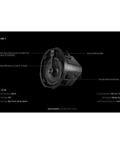 Il suo design compatto, con un diametro di taglio di 290 mm, lo rende facile da installare in una varietà di ambienti a soffitto. Con dimensioni di 321 x 321 x 220 mm e un peso di 5,8 kg, offre un equilibrio tra dimensioni, potenza e discrezione estetica. L’accessorio PK-80T lo trasforma in un diffusore sospeso, offrendo una maggiore flessibilità di posizionamento e una migliore direzione del suono, particolarmente utile negli spazi aperti o dove l’installazione tradizionale a soffitto non è ottimale. Disponibile nei colori bianco e nero, la serie DECO si integra perfettamente con qualsiasi arredamento.