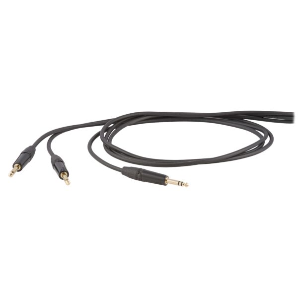 Cavo professionale “INSERT” con con connettori ONEHERO Die Hard / jack Ø 6.3 mm stereo – 2 * jack Ø 6.3 mm mono. Lunghezza: 1,8 metri. Colore disponibile: Nero.
