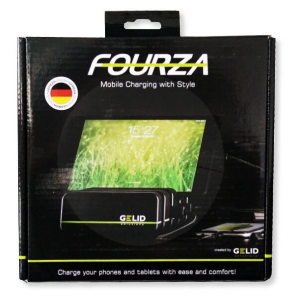 I-CHARGE-FOURZA è una docking station USB che supporta 4 dispositivi mobili di diversi tipi e dimensioni. Fornisce 48W di potenza totale. Lo Smart IC, una parte fondamentale dell’unità di ricarica Fourza, rileva automaticamente la corrente adeguata per i vostri smartphone e gestisce efficienti cicli di carica per consentire una ricarica sicura e per prolungare la vita della batteria. Supporta anche il power di cut-off per i dispositivi compatibili.Il guscio protettivo di plastica ospita il cavo di alimentazione e quattro cavetti micro-USB, proteggendoli sotto la stazione di ricarica. La docking station è molto robusta e protegge i dispositivi da scivoli e urti grazie al rivestimento in morbida gomma. Con alloggiamenti di 15mm di larghezza, si adatta senza problemi ad iPhone, iPad, smartphone, E-book e qualsiasi altro dispositivo mobile. Grazie ai gommini antiscivolo posti sul fondo, la stazione di ricarica risulta sempre stabile e sicura.Caratteristiche• Fornisce sostegno a qualsiasi dispositivo mobile• Rivestimento in morbida gomma antigraffio e antiscivolo• Facile da usare, permette di collegare i dispositivi in un secondo• Rileva automaticamente la corrente adeguata per per l’apparecchio collegato • Elevata corrente in uscita, che ben si adatta a qualsiasi tipo di dispositivo• 48W in uscita: consente di ricaricare fino a 4 iPad Pro contemporaneamente• Assicura cicli di ricarica efficienti e garantisce una lunga durata delle batterie collegate• Realizzato con materiali eco-friendly accuratamente selezionatiSpecifiche tecniche• Rendimento attivo: >87%• Consumo inattivo: 0.06 W• Massima corrente in uscita: 2.4A per porta• Porte USB: 4• Potenza totale in uscita: 48W• Peso: 430 g• Colore: neroDimensioni• Larghezza: 120 mm• Profondità: 190 mm• Altezza: 53 mmCertificazioni• CE• FCC• RoHS• RAEEContenuto della confezione• 1 x Stazione di ricarica Fourza• 4 x Cavo flat USB di ricarica• 4 x Tappettini in gomma per alloggiamenti• 1 x Cavo di alimentazione• 1 x Manuale utente