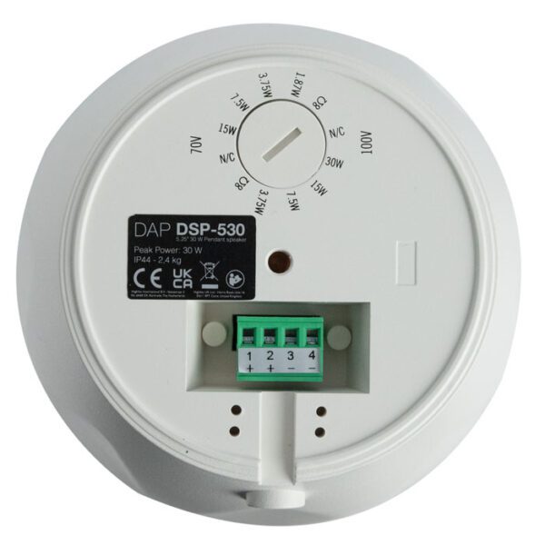 Questo diffusore versatile sospeso da 30 watt offre una qualità del suono eccezionale con bassi profondi emessi dal suo woofer conico in polipropilene da 5,25 pollici e toni medi e alti nitidi attraverso il suo tweeter in seta da 1 pollice. La classificazione IP 44 lo rende idoneo all’uso in ambienti umidi oltre che all’esterno. Il DPS-530 si appende facilmente grazie all’occhiello incluso.