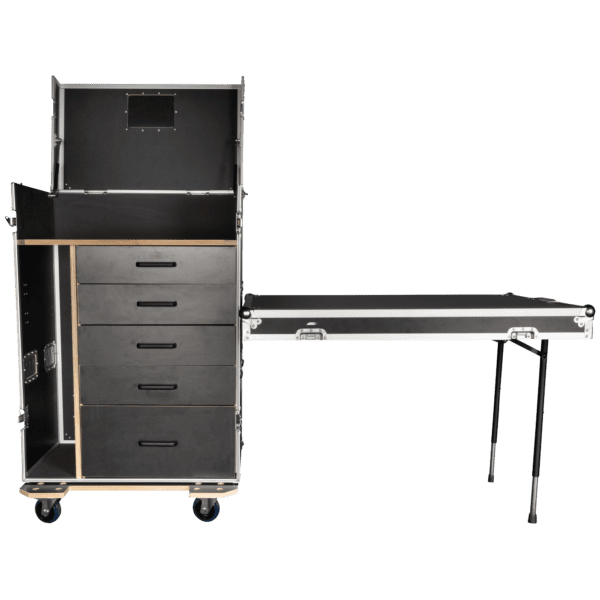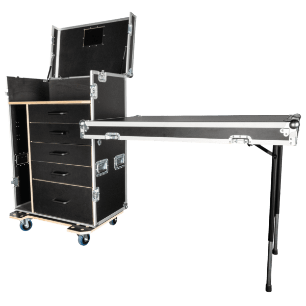 Le sue caratteristiche principali sono le due superfici di lavoro integrate. Il coperchio anteriore, completamente staccabile, si trasforma in un banco di lavoro stabile, sostenuto da due cavalletti integrati e regolabile tra due altezze di lavoro (31” o 35” / 80 o 90 cm) per adattarsi a diversi compiti. Questa superficie di lavoro può essere fissata su entrambi i lati del flight case per ottenere la massima flessibilità. Inoltre, il coperchio superiore incernierato è dotato di molle a gas, che consentono di utilizzare la parte superiore del flight case come seconda superficie di lavoro.
