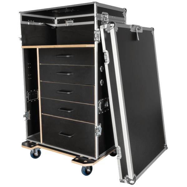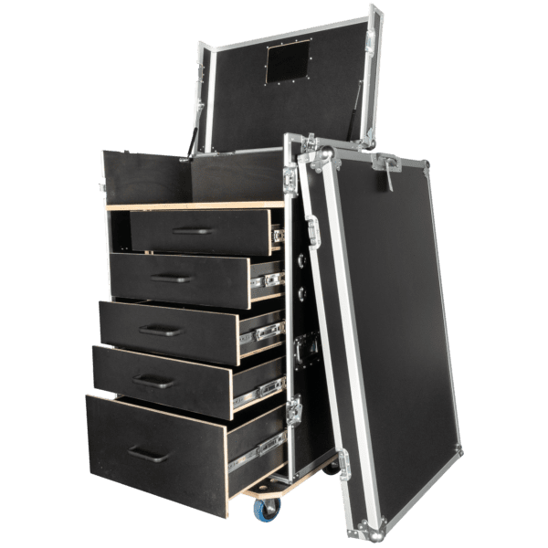 Il Drawer Case 2 di Showgear è un flight case multifunzionale progettato per i professionisti che hanno bisogno sia di uno spazio di stoccaggio organizzato che di uno spazio di lavoro flessibile in loco. Dispone di cinque cassetti: uno basso, tre di media altezza e uno alto; ideali per riporre utensili, accessori e attrezzature di varie dimensioni.