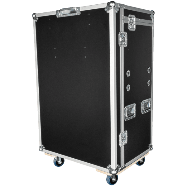 Il flight case è costruito con componenti Penn Elcom di prima qualità per una lunga durata. Cinque maniglie ergonomiche assicurano una manipolazione confortevole, mentre quattro ruote girevoli con freno garantiscono una mobilità fluida e un posizionamento sicuro. È incluso un porta-etichetta per una rapida identificazione durante il trasporto o lo stoccaggio.