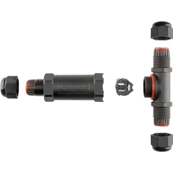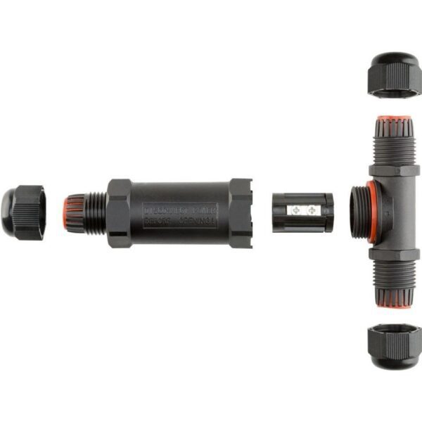 • Elemento di connessione a T per cavi, IP 68, ideale per la posa di cavi in installazioni esterne• Molto facile da montare• Struttura impermeabile, ideale per installazioni elettriche all’aperto• Adatto per cavi con sezione da 1,0 a 2,5 mm²• Portata massima di corrente: 450 V, 24 A• Classe di protezione: IP 68