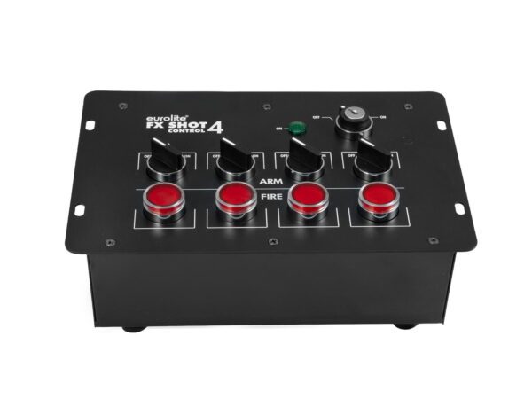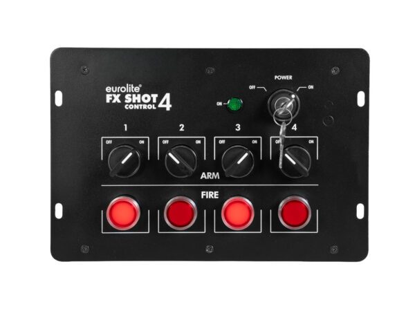 The 4-channel control system FX SHOT 4 is ideal for triggering a wide range of special effects devices, including confetti and streamer launchers and CO2 effects. The device has a key switch with status indicator and red trigger switches. Additional safety switches in the channels prevent accidental triggering. The FX SHOT 4 provides P-Con terminals for all connections.
