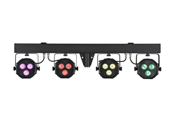Bar with 4 powerful 4in1 QCL RGB/WW spots, AirW wireless system (2.4 GHz), wireless remote control and transport bag