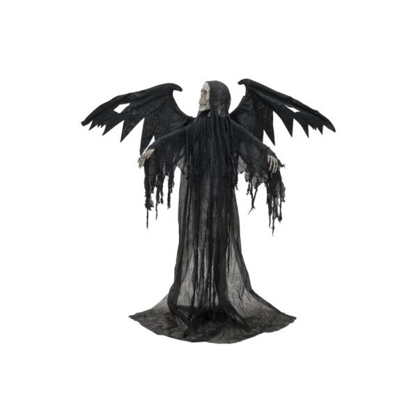 The black angel of death is an impressive and terrifying Halloween decoration for your premises.The spooky figure depicts a sinister angel of death with his wings spread wide, just waiting to capture all the poor souls and drag them off to the realm of the dead. He is clad in a gloomy, floor-length robe, which is completed by a black, frayed, ragged cloak that also covers his skull. His arms with their gnarled hands can be individually bent into shape to give him even more expression.When the animation is activated, the black angel tosses its head back and forth while its eyes glow a menacing red. At the same time, his wings move, giving the impression that he is about to pounce on his victims at any moment. This ominous effect is accompanied by his bitterly evil laughter, while cries of fear can already be heard in the background.The figure’s animation can be activated via an integrated microphone or wired manual control. It is powered either by batteries, a USB-A cable for 5 V operation via power bank or mains adapter.