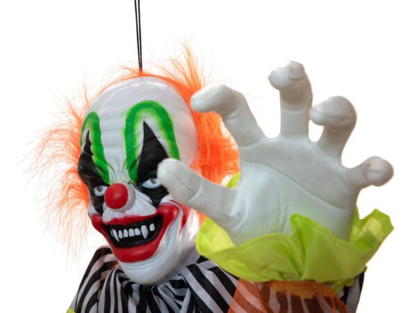 Long gone are the days when colorful clowns caused hilarity – at least since figures like “Curby” entered the stage. Curby is no joker – he is a Halloween nightmare come true, wreaking havoc in dark doorways and corners.The decorative character is an animated hanging figure whose body dangles loosely downwards and ends in a fringed robe – instead of feet, the lower part blurs into a ghostly silhouette. His wide one-piece suit, a sort of harlequin suit, is covered with colored dots in different sizes, while the sleeves and collar scarf are in striking striped patterns.His face is painted lime white, with a bright red clown’s nose and black-rimmed eyes topped with bright green arches, while his hair is bright orange. His white, bony hands are pointed forward as if he wants to grab his next victims. As soon as the animation starts, his LED eyes begin to flash ominously. In combination with creepy sayings and a malicious laugh, the whole body shakes as if it can hardly contain itself with joy at the approaching horror.The Halloween figure’s animation is activated by an integrated microphone or wired control. A loop attached to the head serves as a hanger.