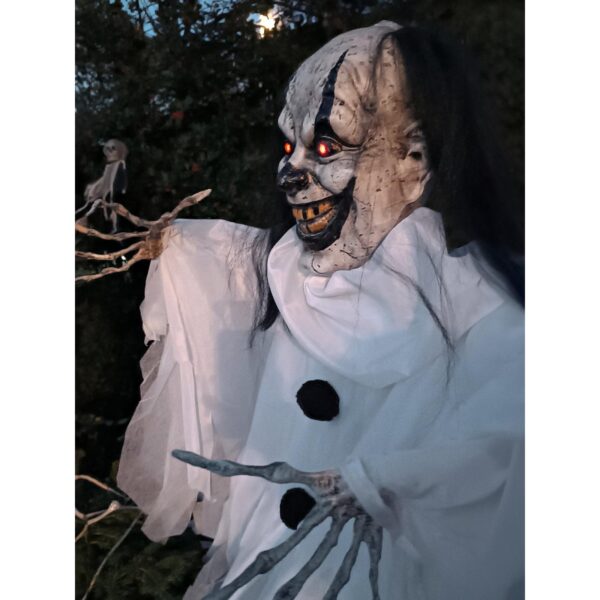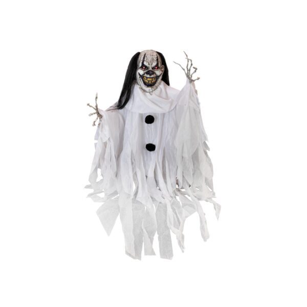 GILDO is no ordinary clown – with his eerie charm and frightening laugh, he will give the guests at your Halloween or theme party goosebumps.The animated Halloween figure from Europalms consists of the torso of a clown in a tattered, white robe with black pom-poms. His head appears in a spooky shade of gray, while his long hair comes in a vibrant shade of black. The typical clown paint is completely black and his broad grin reveals black and yellow teeth. His arms can be effortlessly bent into shape, allowing you to adjust his posture and expression as you wish. The grotesque limbs – skeletal hands with skinny bones that appear almost superhumanly long – also reinforce his eerie appearance. But the creepiest thing about Gildo is his gruesome laugh, which sounds while his eyes flash dangerously red.The deco figure’s animation can be activated using the integrated microphone or wired manual control.