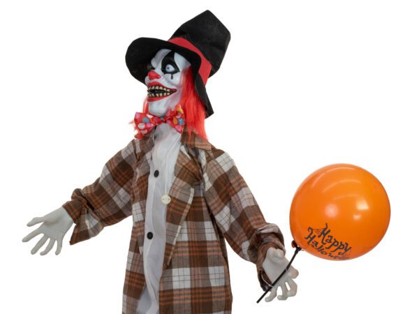 In the circus and at fairs, clowns were once the darlings of the public – cheerful, colorful and entertaining. But when the boundaries between laughter and horror become blurred, figures like “Hatty” emerge – an embodiment of pure unease in a clown’s costume. With his sinister charisma, Hatty is guaranteed to give you goosebumps and will be remembered as the macabre highlight of any Halloween scene.Dressed in a white shirt, a checked tunic and red shoes, he looks almost chic, but first impressions are deceptive. His white-painted face is dominated by a grotesquely exaggerated, blood-red painted mouth, whose grin promises less joy than madness. The equally red-painted nose and black-framed eyes with tears running down his face reinforce the gloomy overall impression. Shoulder-length hair in bright red spills out from under a black floppy hat. His arms can be easily bent into shape and move up and down using a motorized mechanism. The head also performs circular movements, accompanied by a mixture of ghost train sounds, demonic laughter and a menacing clown voice announcing doom. In stark contrast to the spooky appearance, the orange balloon looks like a grotesque detail.The clown’s animation can be activated using the integrated microphone, the “Step here” switch pad or wired control. Power can be supplied via battery operation, USB-A cable for 5 V operation via power bank or mains adapter.