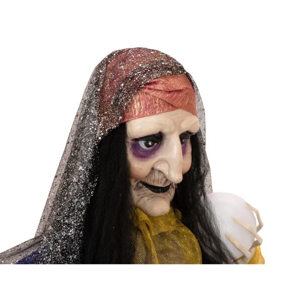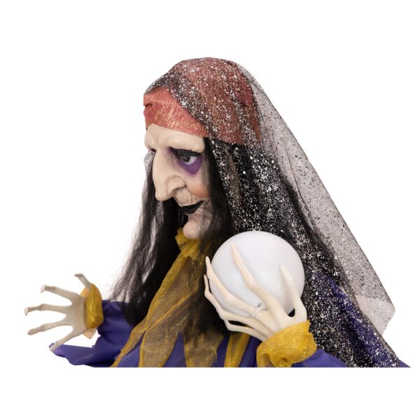 Can the fortune teller from Europalms really predict the future?With her magic orb, she is definitely well prepared to entertain the visitors of your Halloween or theme party.The animated bust is wrapped in shimmering and glittering clothes and her face is prominently made up. Her bony, spindly fingers hold a magic orb that glows mysteriously in various colors. During the divination, her arms move forward and backward and her head performs trance-like circular movements with red flashing eyes.The animation is activated by light sensor (between the black made-up lips), by integrated microphone or wired manual control. Please make sure you have a sufficiently large and secured set-down area before operating the device, as the figure moves on its own.