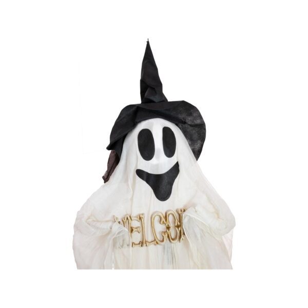 It doesn’t always have to be scary! Welcome your guests with our friendly white ghost, who conjures up a friendly atmosphere with his pleasant appearance.The “body” of the approx. 215 cm tall decorative figure is made of airy white fabric. This gives it a certain lightness and inviting appearance, encouraging the viewer to come closer. He wears a black pointed hat on his head, to which a loop is attached, which serves to hang the decorative figurine. He greets your guests with big eyes and a broad smile, while a WELCOME sign made of artificial bone is also located between his slightly bendable arms.LED fairy lights are attached under the fabric of his robe, creating a magical lighting effect that resembles a gentle waterfall of light. This gives the ghost a warm and inviting aura, making it a friendly greeting in the entrance area or as a room decoration.Thanks to an integrated timer function on the on/off switch, the lighting can be easily controlled: The lights stay on for 6 hours and then automatically turn off for 18 hours. Additionally, there is an option to manually control the LEDs with a wired button – they stay lit as long as the button is pressed.