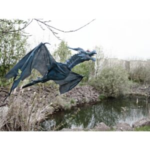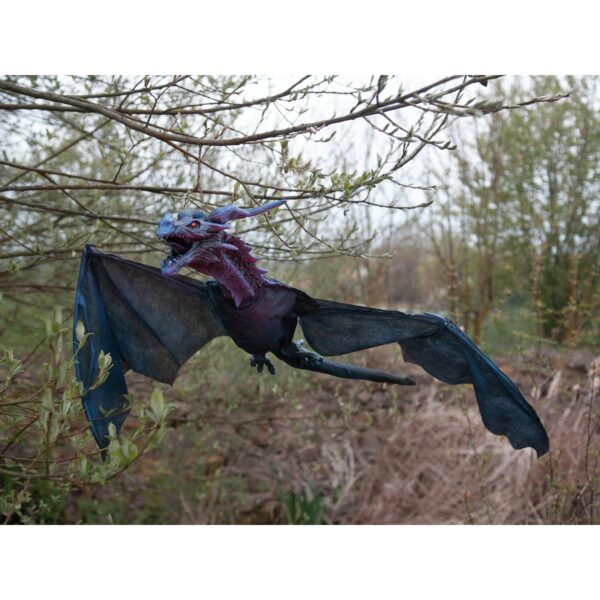 This dragon figure completes your decoration for a Halloween or theme party:The dragon is based on the well-known pictures from mythology and looks out for prey with its mouth wide open. He moves his head to the left and right in order to be able to see his surroundings better. His wings – with an impressive wingspan of up to 120 cm – move up and down. An eerie sound and red flashing LED eyes complete the animation. It is activated by an integrated microphone or wired manual control. Thin nylon cords serve as suspension.
