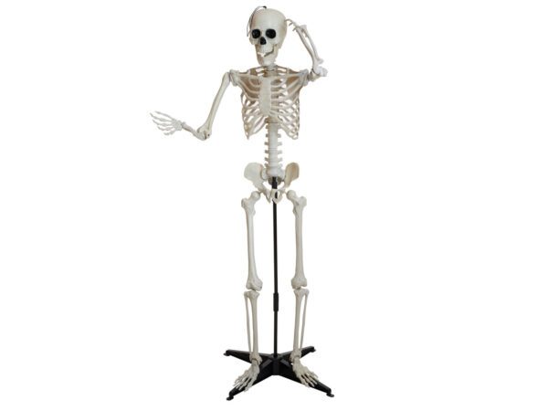 Abandoned cemeteries, rotten gravestones and the creaking of beams – when the echo of past lives appears, the skeleton is not far away. It rises from the depths of long-forgotten crypts – silent, motionless and yet disturbingly present. A skeleton is simply part of every successful Halloween backdrop. As a symbol of death, it is an indispensable element that should not be missing in any gruesome production.With a size of approx. 150 cm, the Halloween skeleton from Europalms offers a wide range of options for spooky decorations. Although the figure remains mute and motionless, this is precisely where its fascination begins. Placed in half-open doors, draped on old chairs or seemingly carelessly leaning against a wall, it gives the impression that it could start moving at any moment. Particularly ingenious: The arms can be bent at any angle and remain stable in their position. Whether raised defensively, stretched out to reach for a victim or theatrically crossed over the skull: this creates individual, lively-looking poses.The timeless creepy element can either be placed on a stand or staged as a hanging figure using a loop on the skull.