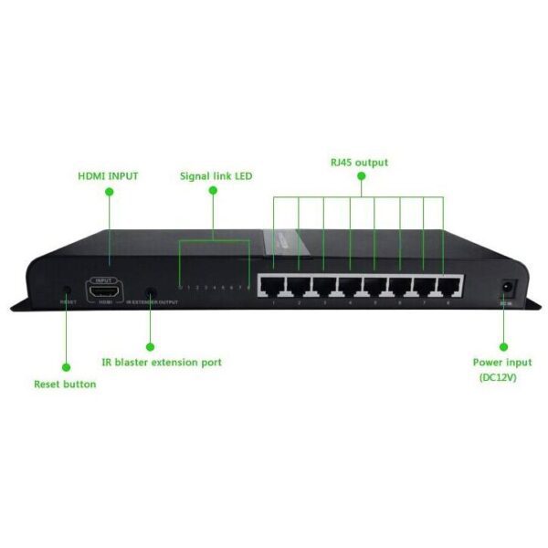 IDATA EXTIP-318V4 è uno splitter HDMI che applica la tecnologia HDbitT per distribuire una sorgente HDMI a 8 display HDMI su cavo CAT6/6a/7 a ricevitori compatibili nello stesso momento (kit costituito da una base/trasmettitore e un ricevitore aggiuntivo). Supporta la trasmissione a distanza fino a 120 metri e la risoluzione massima di 1080P.
