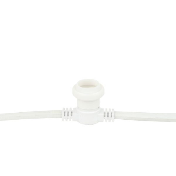 È realizzato con cavo in gomma nera e classificato IP44, con prese E27 a intervalli regolari, adatte per lampadine normali e a LED. Può essere collegato in serie in modo sicuro attraverso i suoi connettori terminali a vite. Festoon Light E27 è disponibile in diverse lunghezze, con due diverse distanze tra le prese, e in nero o bianco.