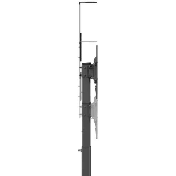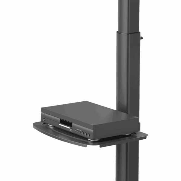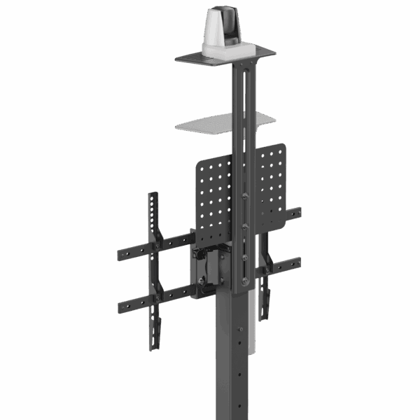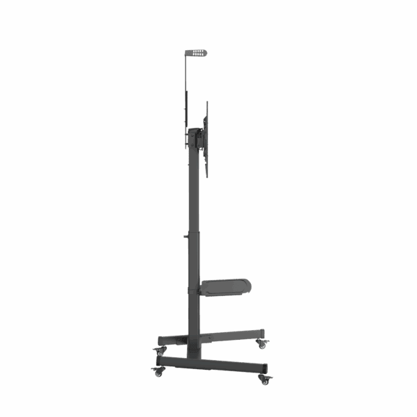 Presenta un blocco a molla a sgancio rapido per una regolazione fluida dell’altezza, oltre a una funzione di inclinazione senza utensili (da +5° a -12°) per un comfort visivo ottimale. Il carrello supporta l’orientamento verticale e orizzontale e include ripiani regolabili in altezza per le apparecchiature AV e le telecamere. Le rotelle bloccabili per impieghi gravosi assicurano una facile mobilità e stabilità, mentre la gestione integrata dei cavi mantiene tutto in ordine.