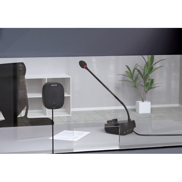 Interfono per sportelli che facilita la comunicazione attraverso vetri o pannelli divisori.