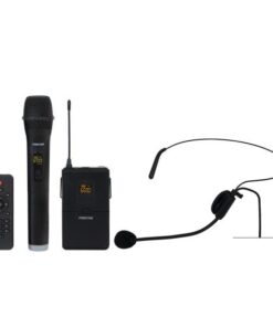 2 microfoni wireless UHF, 1 palmare e 1 sospeso (650 MHz e 660 MHz).