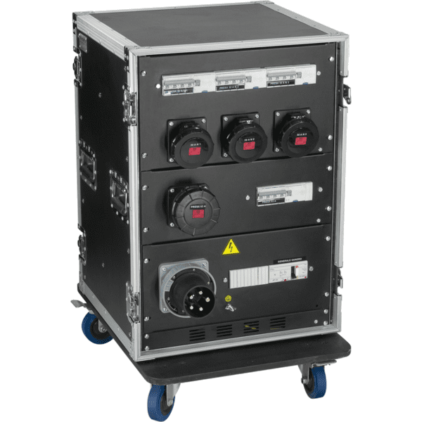 Power-box, input 125A 5p, output: 12x16A 3p, 5x32A 3/5p 1x63A 5p, 1x16A shuko