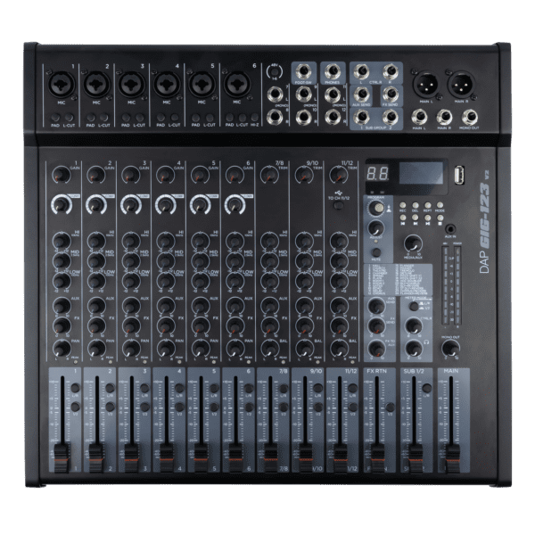 Il GIG-123 V2 di DAP è un mixer a 12 canali compatto ma capace, progettato per le esibizioni dal vivo, le sessioni in studio e le configurazioni ibride. Offre un’ampia gamma di ingressi, opzioni di instradamento, funzioni professionali ed effetti integrati, rendendolo ideale per i musicisti, i tecnici del suono e i creatori di contenuti che richiedono flessibilità senza compromettere la qualità del suono.