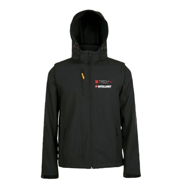 · Giubbotto SoftShell in tessuto tecnico completo di cappuccio con visiera e maniche removibili