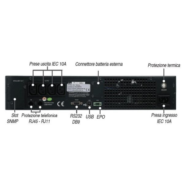 • Gruppo di continuità On Line Doppia Conversione con potenza nominale 1000VA – 800W• Forma d’onda sinusoidale a bassa distorsione• Dotato di 2 batterie 12V DCSpecifiche• Potenza nominale 1000VA• Tecnologia On Line a doppia conversione• Forma d’onda 100% sinusoidale a bassa distorsione• Elevata affidabilità dell’UPS- Specificatamente progettato per utenze sensibili- Controllo totale a microprocessore- Test batterie manuale ed automatico• Basso impatto sulla rete • Modalità di personalizzazione- Funzionamento On Line- Funzionamento Eco Mode (risparmio energetico)- Funzionamento By pass (UPS spento predisposto in funzionamento da By pass con batteria in carica)- Settaggio tensione uscita (220-230-240Vac)- Funzionamento con alimentazione da generatore• Auto Restart (ripristino automatico al ritorno di rete)• Cold Start (accensione da batteria)• Display LCD per segnalazioni ottiche di informazione: carico, batteria, misure ingresso, misure uscita e modalità operativa.• Display orientabile Tower / Rack• Diagnostica evoluta, allarmi UPS disponibili su display LCD• EPO (Emergency Power Off) per lo spegnimento dell’UPS tramite pulsante remoto di emergenza• Batterie sostituibili a caldo Hot Swap (solo modelli con batterie esterne)• Possibilità di installazione Rack 19“ (standard) oppure Tower (tramite piedistalli, kit opzionale)• Protezione per rete telefonica e informatica contro sovratensioni su connettore RJ45-RJ11• Comunicazione evoluta- Porta di comunicazione intelligente: RS232/DB9 e USB- Cavo per comunicazione UPS-PC e software in dotazione- Slot per installazione schede di comunicazione, scheda SNMP oppure scheda relè AS400 Collegamenti• Spina in ingresso: 1 x IEC 320 C14 10A• Prese in uscita: 4 x IEC 320 C13 10ACaratteristiche fisiche• Dimensioni: 440 x 88 x 454 mm • Temperatura operativa: 0-40°C• Umidità relativa: 0-95% senza condensa• Colore: neroContenuto della confezione• 1 Gruppo di continuità 1000VA • 1 cavo ingresso 10A• 1 cavo uscita 10A• 1 cavo seriale • 1 software