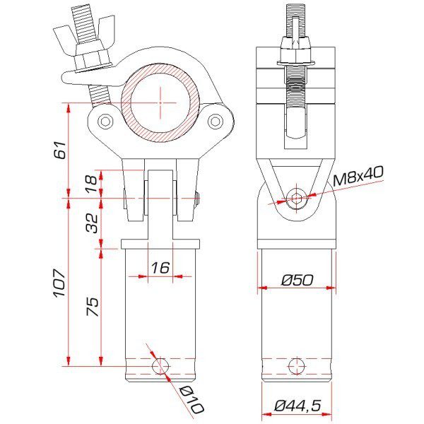 STAFFA CON MASCHIO DI ALLUMINIO 45MM, PER TUBO DIAMETRO DA 48/51MM