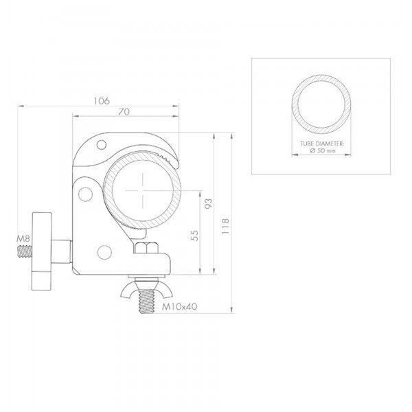 Mini morsetto a sgancio rapido in alluminio per carichi fino a 100 kg. Dotato di manopola ergonomica, bullone e dado ad alette per fissare fari, dispositivi elettronici, ecc. Progettato per l’uso su tralicci/tubi con diametro esterno da 48 mm a 51 mm.