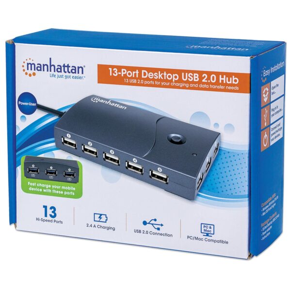 • Fornisce 13 porte USB 2.0 Hi-Speed per periferiche aggiuntive• Sostituisci gli hub poco prestanti con un hub con design multiporta e un alimentatore potente da 4 A• Permette la ricarica veloce di una periferica, fino a 2.4 A, con tasto di controllo • Alimentazione versatile tramite bus o AC con protezione da sovracorrente, con cavo secondario integrato per alimentazione aggiuntiva tramite bus • Plug and play; hot-swappable• Compatibile con tutti i pc provvisti di USB• Compatibile con Windows e MacStandard e certificazioni• USB 2.0, USB 1.1, USB 1.0• FCC• CEPorte• Velocità di trasmissione: 1.5 / 12 / 480 Mbps• 2 porte upstream, Standard A• 13 porte downstream, Standard A• Porta 5VDC • Alimentazione fino a 500 mA, per tutte le porte• Alimentazione fino a 2.4A, 1 porta (con trasferimento dati disattivato), attivo per le porte 5-8 • Multiple Transaction Translator (MTT) attivo per le prote 1-4, 9Informazioni fisiche• Dimensioni: 121 x 71 x 25 mm• Peso: 147 g• Cavo USB integrato, Standard A, 100 cm- Include un cavo USB secondario integrato, Standard A • Tasto trasferimento dati / ricarica: On/Off• Alloggiamento: plastica ABS• Indicatore LED di alimentazioneAlimentatore• Ingresso: 100 – 240 V, 50/60 Hz; 0.68 A, massimo• Output: 5 V / 4 A• Cavo: 1.8 mRequisiti di sistema• Sistemi PC o Mac abilitati USB• Windows XP/Vista/Windows 7/8/10 o Mac OS 9 o superiore • Porta USB disponibileContenuto della confezione• Hub USB desktop Hi-Speed• Alimentatore• Istruzioni