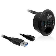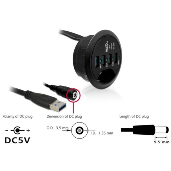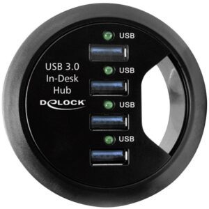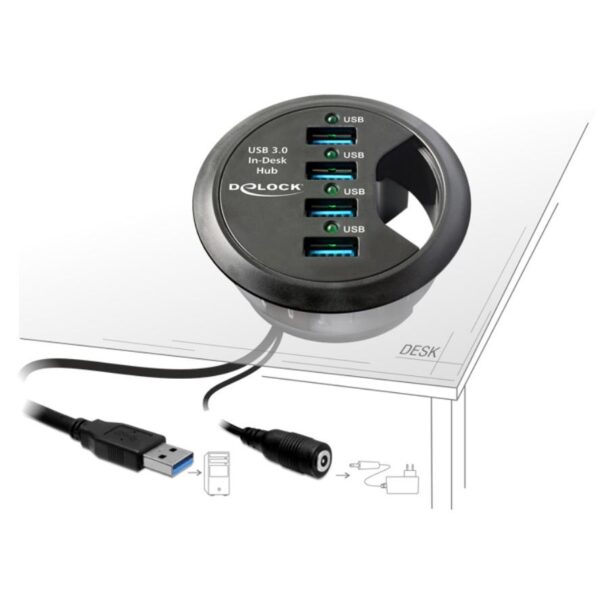 Questo hub Delock ad adattamento versatile permette di collegare in modo facile e veloce flash drive, fotocamere e molto altro, lasciando libero lo spazio attorno al computer. Può essere installato direttamente sulla scrivania e consente di condurre i cavi per monitor, tastiera e mouse. Rappresenta una pratica soluzione salvaspazio.Specifiche tecniche• Connettori: lato superiore: 4 x USB 3.0 Tipo-A femmina sul fondo: 1 x USB 3.0 Tipo-A maschio 1 x 5 V DC jack• Velocità di trasferimento dati fino a: SuperSpeed USB 5 Gbps, Hi-Speed 480 Mbps, Full-Speed 12 Mbps, Bassa velocità 1,5 Mbps• Diametro di montaggio: 60 mm• Profondità di montaggio: 30 mm• Lunghezza del cavo USB: 115 cmAlimentazione• Alimentazione a muro• Ingresso: AC 100 ~ 240 V / 50 ~ 60 Hz / 0,5 A• Uscita: 5V / 4A• Fuori terra, oltre all’interno• Dimensioni: all’interno: ø ca. 1,35 cm fuori: ø ca. 3,5 cm lunghezza: ca. 9,5 cmRequisiti di sistema• Windows XP / XP-64 / Vista / Vista-64/7 / 7-64 / 8.1 / 8.1-64 / 10 / 10-64• Linux Kernel 3.x,• Mac Lion 10.7.4• PC o laptop con porta USB liberaContenuto della confezione• Hub USB da scrivania• Alimentatore • Manuale utente